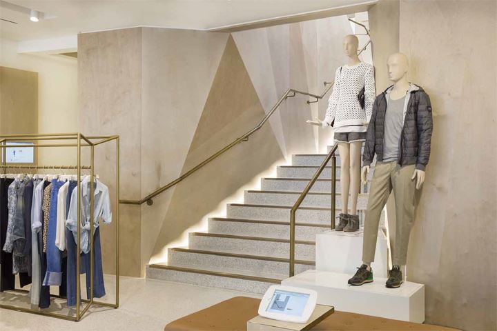 The store design has a simple palette of materials, including terrazzo and toned timber veneer, which blend to create a calm sensibility, providing a neutral yet inviting backdrop against which to display a diverse range of apparel. The ground floor focuses on contemporary denim, footwear and accessories. Here, the midfloor furniture consists of generous and versatile display tables with pop colour elements. Twin hanging rails, one solid and the other in wireframe form, punctuate the spaces between.